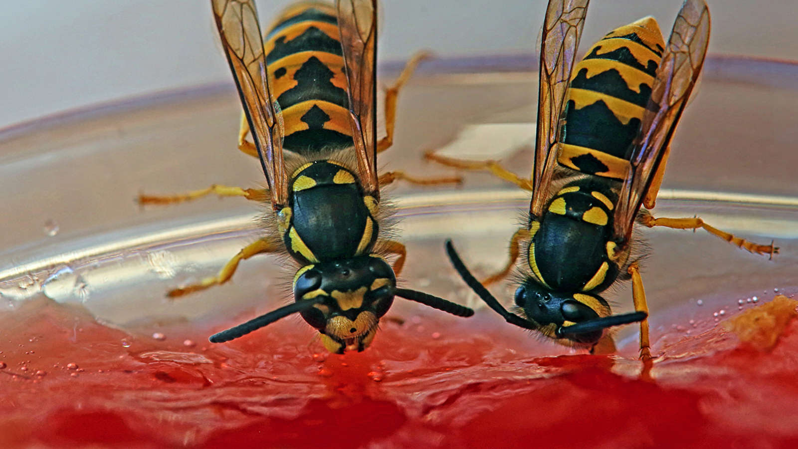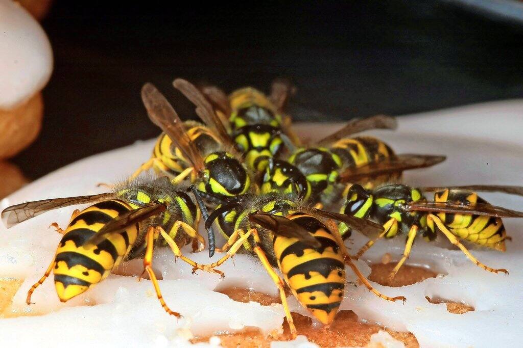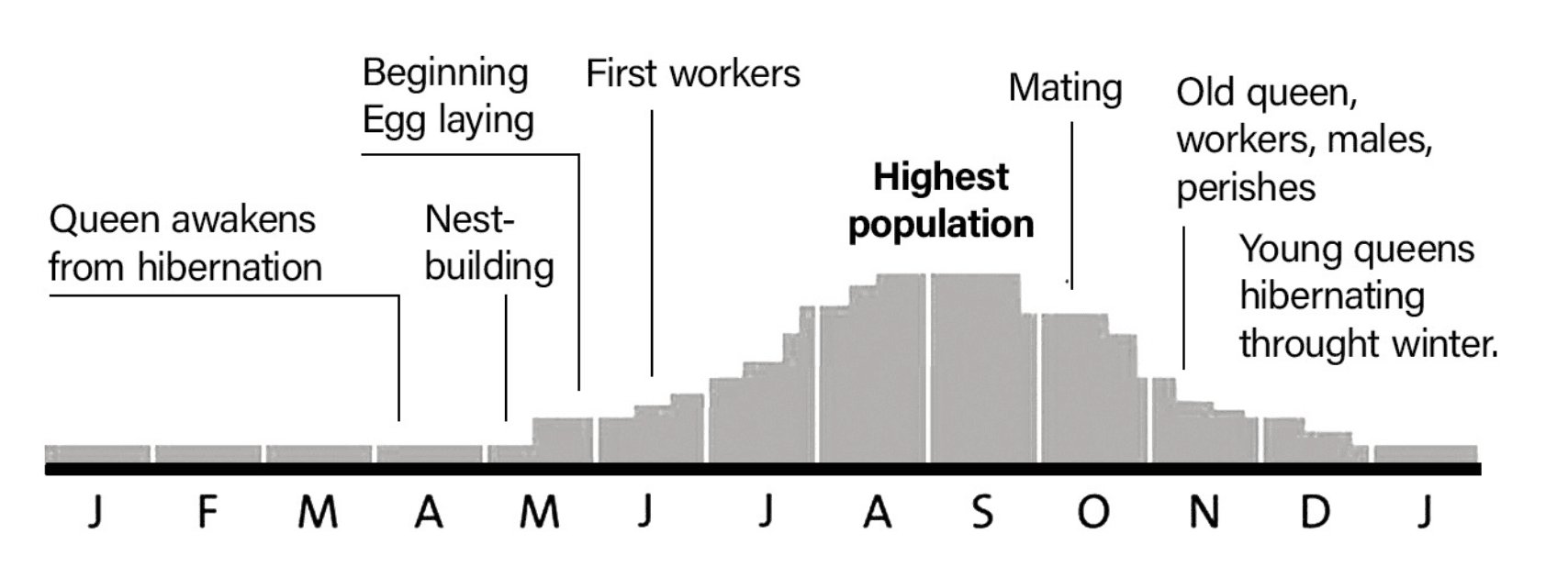 By late summer, hungry wasps fly around after their natural source of sugar (secretions from larvae) disappears. Earlier in spring, fertilized queens emerge from hibernation, build nests, and lay the first eggs. These develop into workers that expand the nest, forage, and feed the larvae. In return, the larvae provide a sugary liquid that sustains the workers. As the colony reaches its peak size, the queen reduces or stops laying eggs, which means no new larvae and no secretions. With the sugar supply gone, workers seek food outside the nest, often near people. By autumn, the colony collapses: the workers and the old queen die, while only newly fertilized queens survive to hibernate until the following spring.